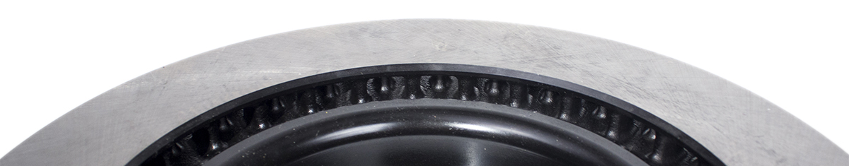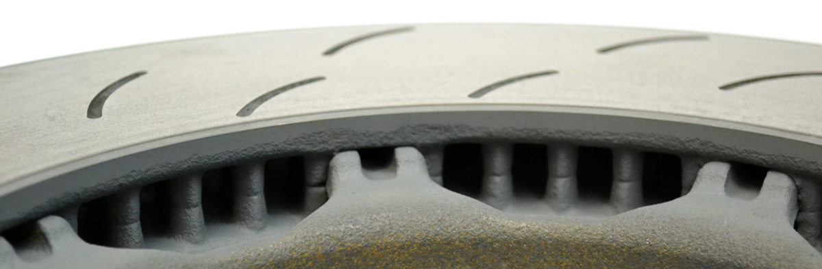 The internal vane design on AP J Hook Discs is quite a bit different vs. OEM-style discs and other brands of aftermarket discs. Many OEM discs feature a pillar vane design, which can be thought of as a group of posts or pillars connecting the two disc halves together (see pic below). The pillars are not organized linearly from the outside to the inside of the disc, and turbulence is created as air flows through and among them. Pillar vane discs are therefore not particularly well suited to heat evacuation. The goals of a pillar vane design are disc face stability for low NVH (noise, vibration, harshness), and a low cost of production. Pillar vanes are non-directional, and the same part number is used on both sides of the car (again for cost reduction). Other OEM discs feature a straight, non-directional internal vane. While that type of vane flows more air than a pillar, it does not move nearly as much air as the directional vanes featured in AP Racing's discs. Having directional vanes means that AP Racing discs are handed. There is a unique left disc and a right disc in each pair, and they cannot be swapped from side-to-side on the car. The orientation of the vanes is optimized to spin in a certain direction, pumping the maximum amount of air possible through the disc. The shape of these internal vanes is also optimized to promote smooth airflow.