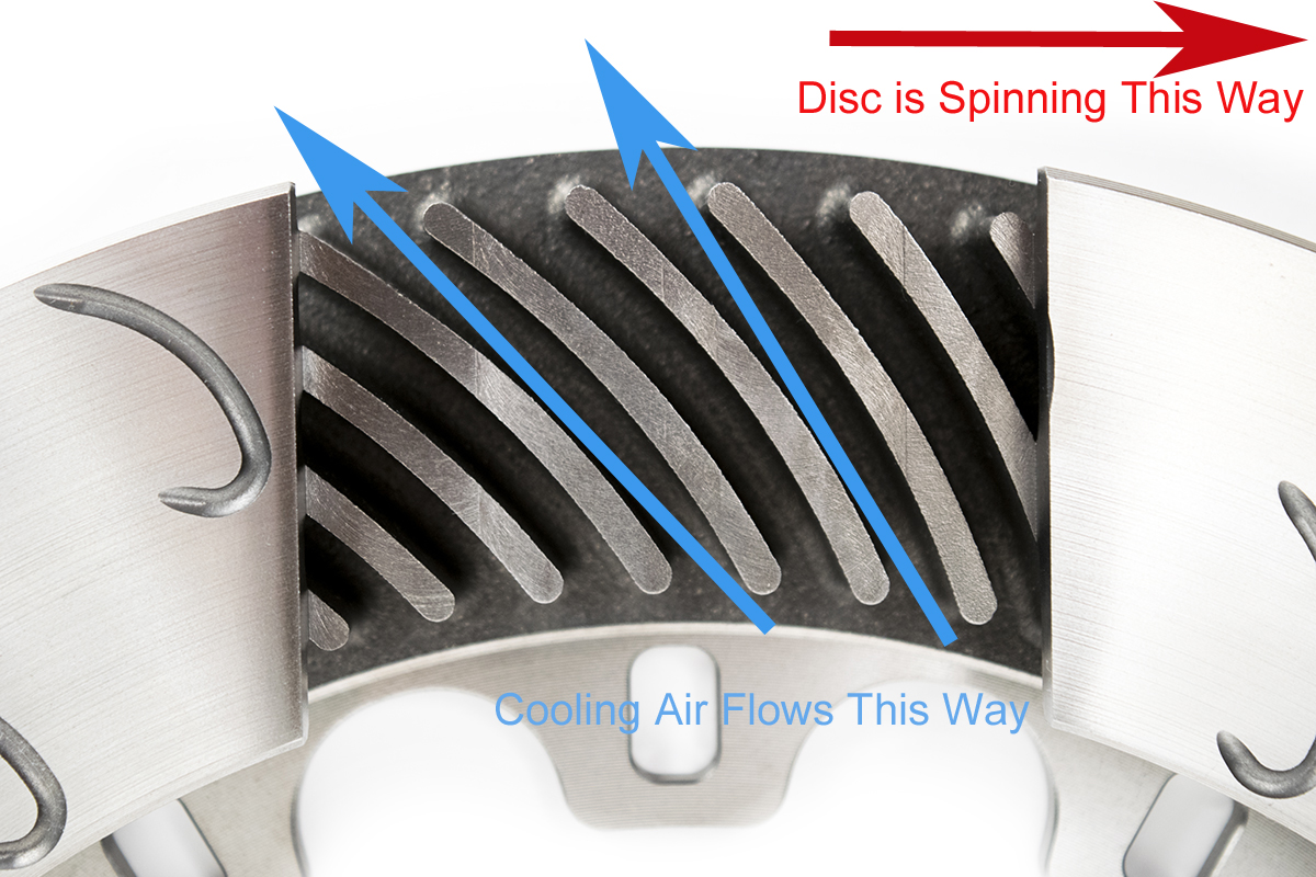 The internal vane design on AP J Hook discs is quite a bit different vs. OEM-style discs and other brands of aftermarket discs. Many OEM discs feature a pillar vane design, which can be thought of as a group of posts or pillars connecting the two disc halves together (see pic below). The pillars are not organized linearly from the outside to the inside of the disc, and turbulence is created as air flows through and among them. Pillar vane discs are therefore not particularly well suited to heat evacuation. The goals of a pillar vane design are disc face stability for low NVH (Noise, Vibration, Harshness), and a low cost of production. Pillar vanes are non-directional, and the same part number is used on both sides of the car (again for cost reduction). Other OEM discs feature a straight, non-directional internal vane. While that type of vane flows more air than a pillar, it does not move nearly as much air as the directional vanes featured in AP Racing's discs. Having directional vanes means that AP Racing discs are handed. There is a unique left disc and a right disc in each pair, and they cannot be swapped from side-to-side on the car. The orientation of the vanes is optimized to spin in a certain direction, pumping the maximum amount of air possible through the disc. The shape of these internal vanes is also optimized to promote smooth airflow.