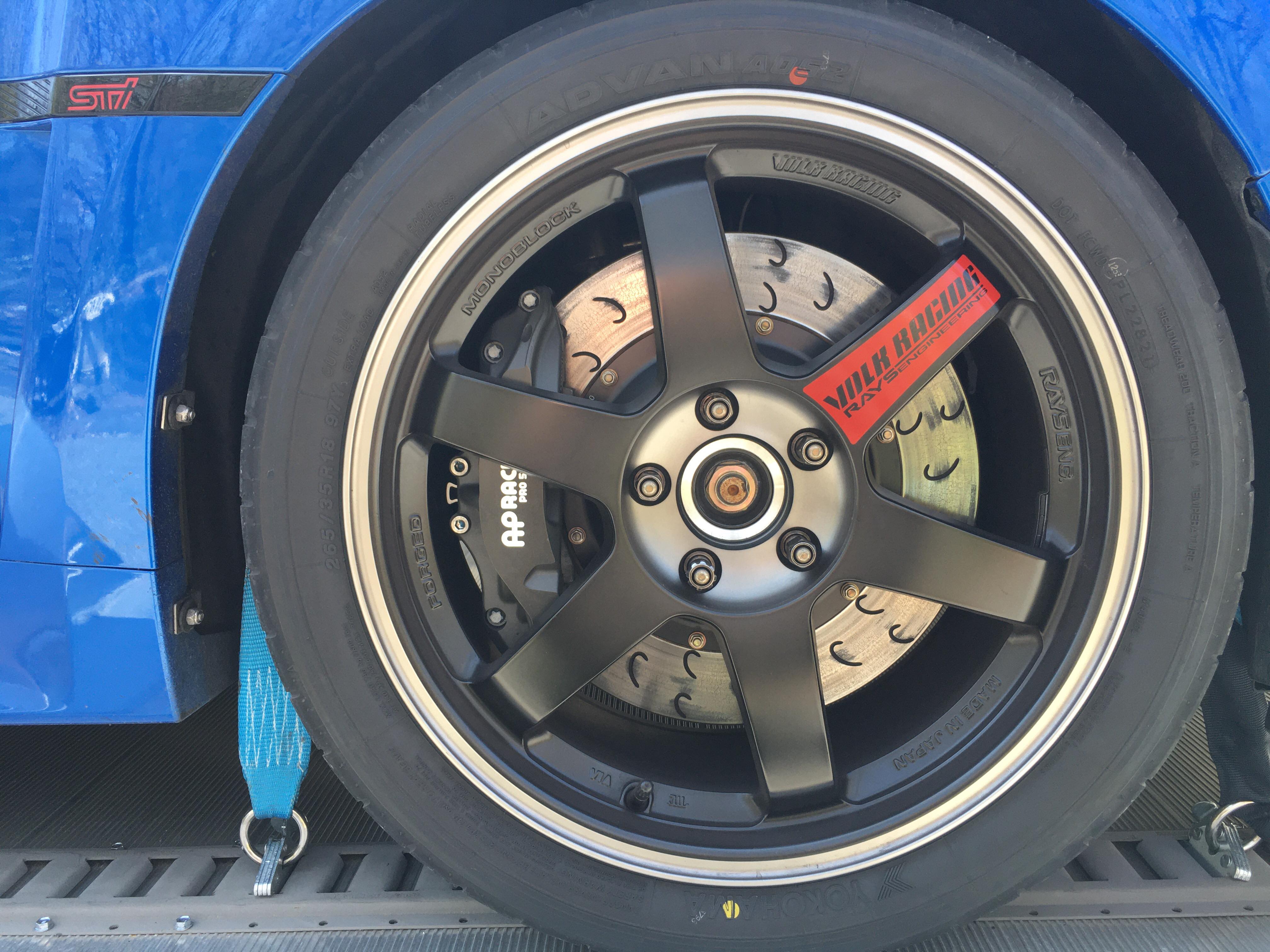 "Thank you for giving me a chance to share my build and usage of the AP Racing Radi-CAL calipers and rotors. I purchased my 2011 STI hatch new when my friend convinced me to join him and his GT3 on the PCA track days he was attending. I traded in my Outback and at first, the STI served double duty as school bus for my kids and daily driver with the occasional weekend fun at the tracks close to central PA. Little by little it became more a track car and less suited for daily use. As I became more experienced, I went down the usual path of band-aiding the stock Brembos with good fluid and pads, then titanium shims, Boomba air deflectors, GiroDisc rotors, and finally a fully ducted set up. I’m sure over the years I spent $3k+ on all those upgrades, not to mention burning through pads faster (they would only last 4 track days at most). Then when doing time trials with SCCA 2 years ago, I had that moment of panic at the end of the straight at Summit point main, when the brake pedal sank nearly to the floor. That day I decided to splurge on a BBK. After some research I decided that the AP Racing Radi-CAL CP 9660 was the most serious track ready setup. Install was a breeze, and they fit perfectly behind my Volk TE 37 SL (18x9, +45). I could not wait for spring to try them out, they did not disappoint. I have used them at Summit main, VIR, and Watkins Glen with solid stopping power and no fade or spongy feel at all. They still look brand new even after repeated heat cycles and abuse. It was worth every dollar I spent on them knowing that I will never have to trust my life on a sub-optimal braking system. Here are a few pics and a link to some videos on YouTube. Thank you for an excellent product and great customer support."