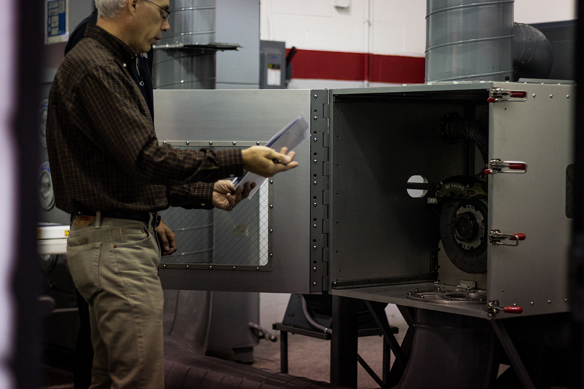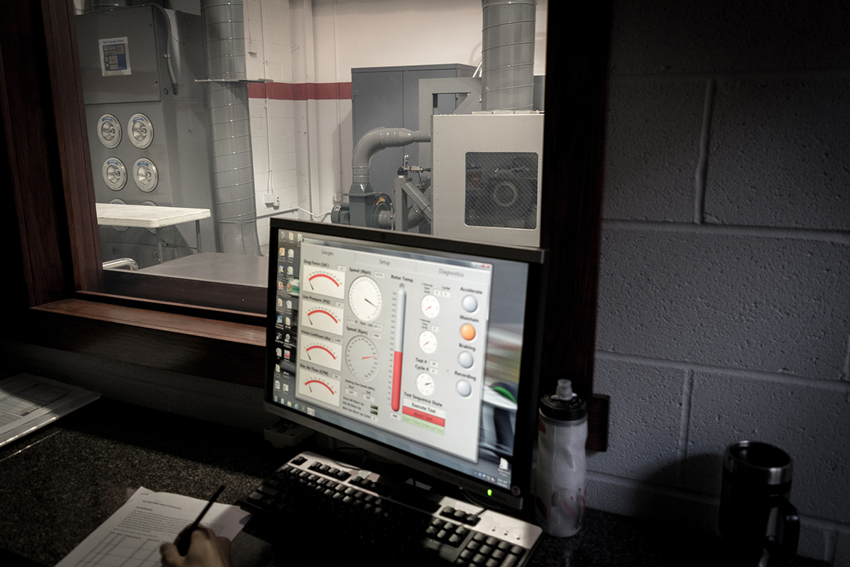 The Essex dynamometer is tunable for a wide range of speeds and brake line pressures, allowing for tests ranging from repeated identical brake events up through full track simulation/replication. Cooling can be individually controlled for the caliper, disc, and across the brake system as a whole. Test speeds of 240 KPH (150 MPH) and temperatures in excess of 1,100 C (2,000 F) can be achieved and recorded at up to 1,600 measurements per second. Through the use of adapters, a wide variety of brake discs and calipers can be mounted.