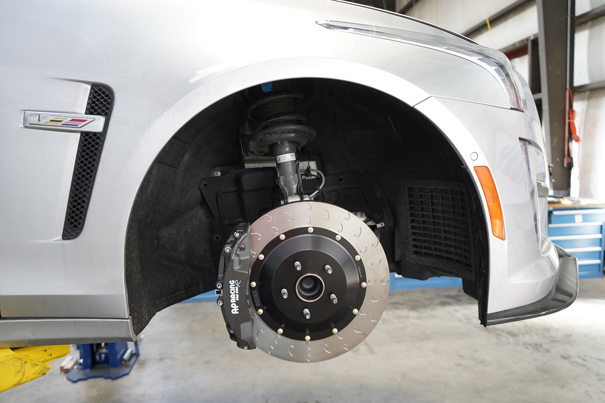04.05.2022Cadillac's third generation CTS-V somehow manages to contain 6.2 liters of supercharged brute force within a practical, luxurious, and fleet-footed package. It clearly benefits from platform and engine sharing with the Gen.6 Camaro ZL1, but at 4200 lb., it's also a good bit heavier with the extra doors and length tacked on. Pushing this sort of weight around a road course, at the speeds made possible by 640 horsepower, requires massive braking power to rein things in before every corner. The factory brake system addresses the vehicle's weight with a correspondingly large amount of mass in the rotors and calipers. But as usual, the stock parts just aren't as effective or efficient on a track as dedicated racing components.
