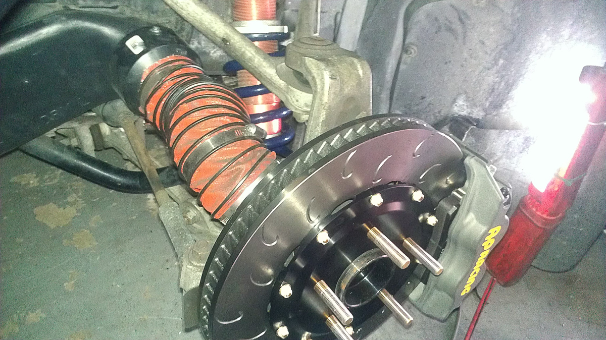 Below is an example of a duct setups that prevents heat radiation from the inner disc face. As heat radiates out of the side of the inner disc face, it is forced directly back into the disc, pad, and caliper. This is why one of the first steps in our brake kit install manuals is always to remove the OEM disc dust shield…we have our reasons!