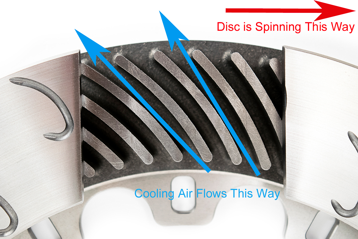 Convection refers to the transfer of heat as fluid (air in this case), as it flows over and through the disc. Some convection takes place as air flows over the friction faces. On an optimized ventilated disc design, even more convection cooling occurs as the air flows through the internal passages. The vanes suck the heat out of the back side of the friction faces, have a very large surface area in contact with the air, and act as a fan pumping air across those surfaces. As air passes across the vanes, it absorbs heat and evacuates it towards the outer edge of the disc. Brake ducts lower disc temperatures by forcing more air through the internal disc vanes. That forced air is coupled with the centrifugal force generated by the spinning directional cooling vanes, drawing additional heat from the disc. The picture below shows an AP Racing J Hook Competition Disc with a high number of directional internal vanes. As a disc spins, those vanes act like a pump or fan, pushing hot air out and drawing cool air in. This is one of the primary reasons why a proper directional racing disc is far more effective and efficient than an OEM-style disc, which in many cases does not even have directional vanes.
