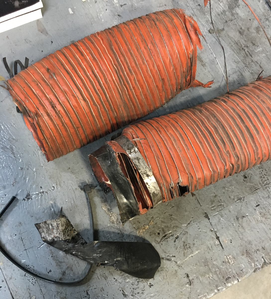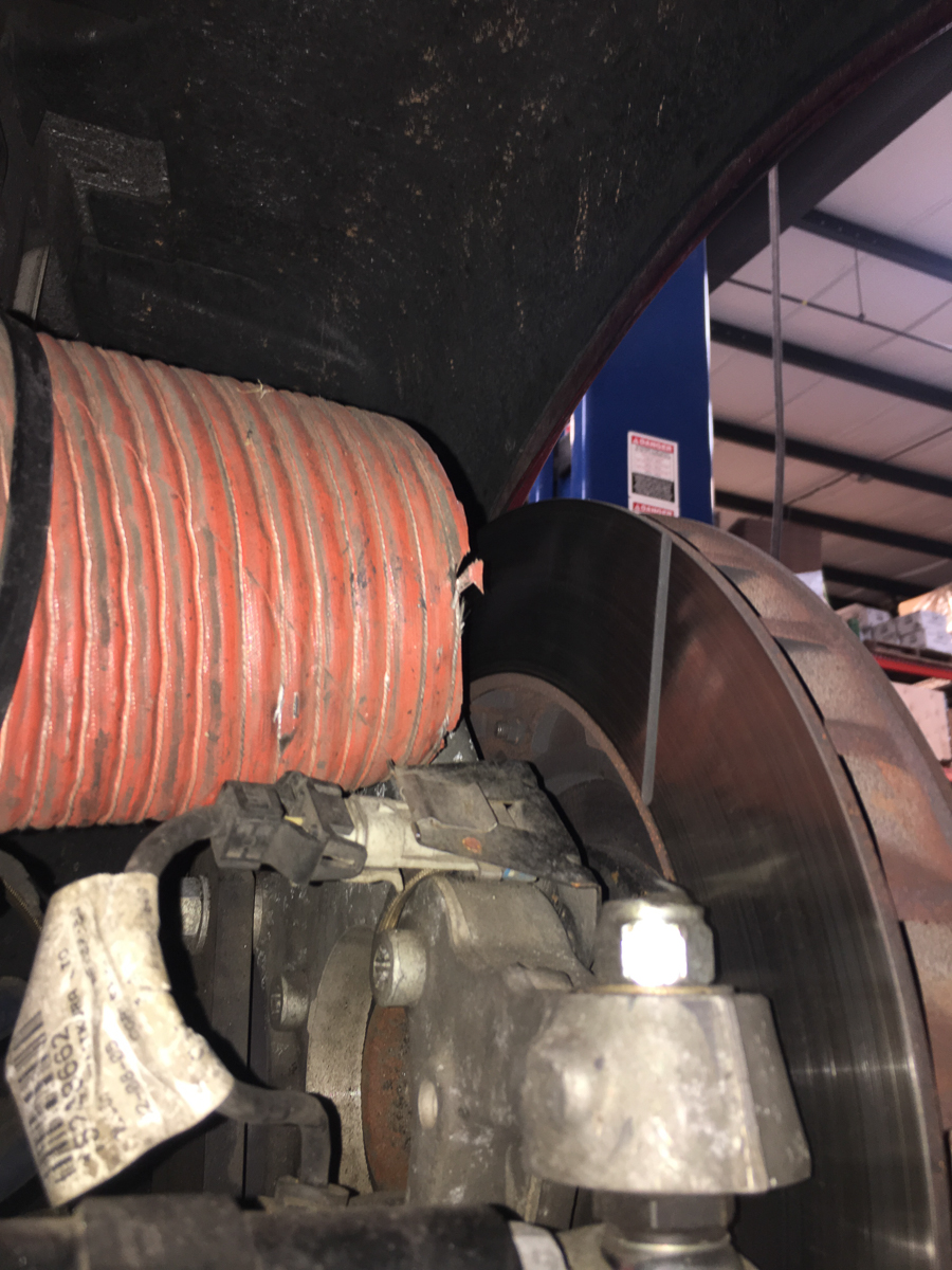 Many of the customer duct setups we’ve seen deposit air in the worst possible location: directly onto the inner disc face, rather than into the internal disc vanes. When you dump a substantial amount of cooling air directly onto the inner disc face, you are promoting disc cracking. The outer disc face continues to run hot, while the inner disc face is blasted with cooling air, which creates an enormous amount of stress between the two halves of the disc. Below is a photo of the terrible duct setup that was installed on the author’s C6 Corvette when he purchased it. Any cool air making it to the disc is dumped directly onto the inner disc face, and virtually none of that air would make it into the internal vanes and the outer disc half. That is a recipe for rapid crack propagation!