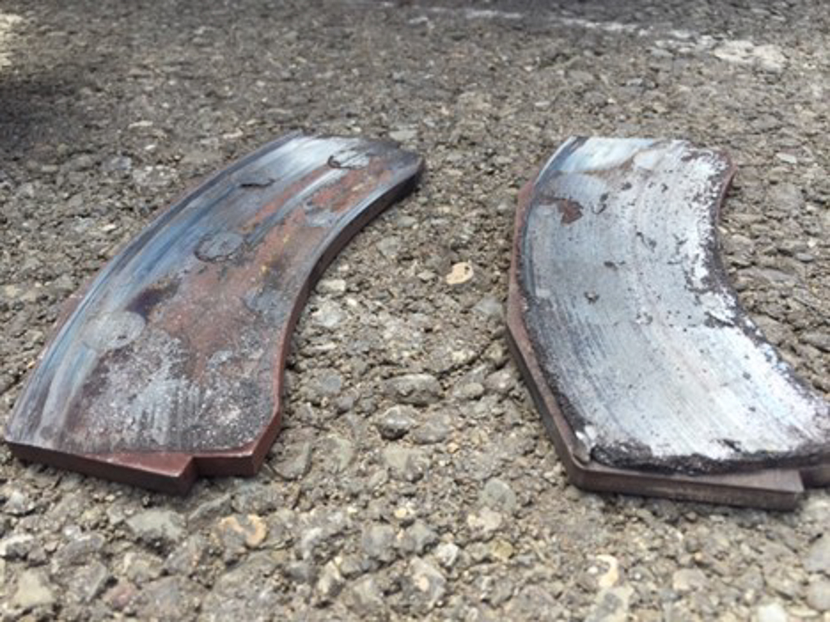 One of the other big problems we see when heat is trapped on the inner disc face is that the inner pads burn far faster than the outer pads. Not only does this negatively impact the overall service life of your pad set, it increases the odds of running your inner pads down to the backing plate and potentially damaging your discs. We have lots of pad examples like the one below, in which one pad was worn down faster and further than the other without the driver realizing it. When people check their pad wear, they commonly check only the outer pad thickness by glancing through the wheel spokes. While at the track you really need to look at the inner pads as well, as wear rates on the inner and outer caliper halves can be quite different, particularly if a cooling problem as described above exists.