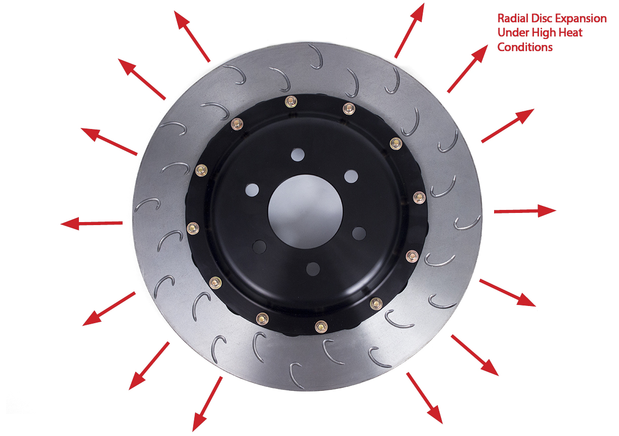 The final way heat escapes a brake disc is via conduction as it travels through the connected metal components of the disc hat, hubs, studs, brake pads, and bearings. On a good 2-piece floating disc, conduction has a much smaller impact on disc cooling, and there isn’t really much we can do to change the amount of conduction cooling.
