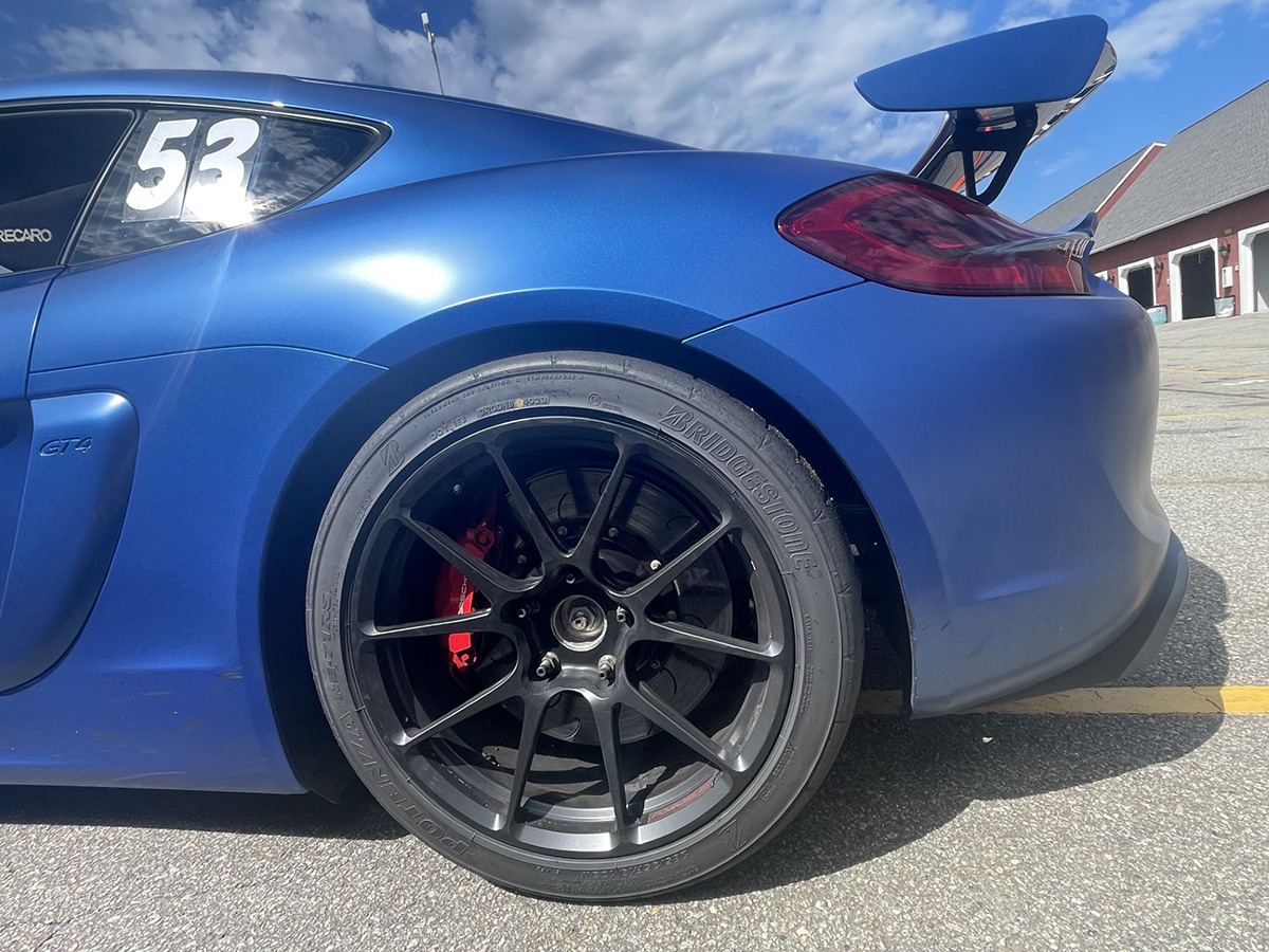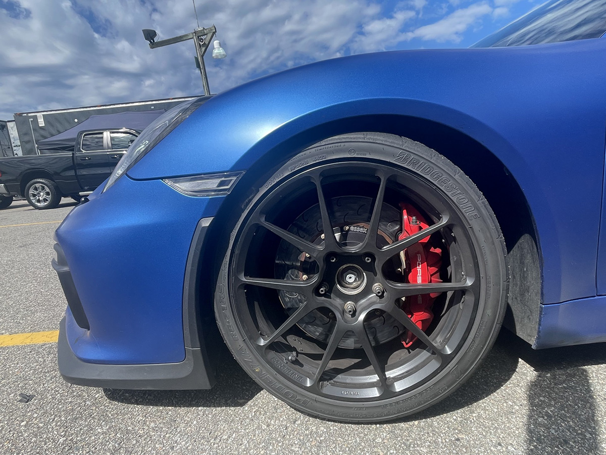 Another Porsche in the paddock wearing Forgeline Wheels and our 2-piece replacements (front kit / rear kit) was this satin blue Cayman GT4.