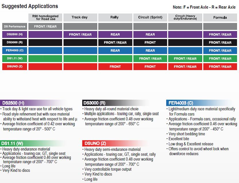 Essex is the exclusive North American importer and distributor of Ferodo Racing brake pads. We have been working with and recommending Ferodo Racing products for over a decade now, and we have weekly shipments of their pads arriving from Italy. Below are our general pad compound recommendations. However, please don't hesitate to ask for our recommendation for your specific usage environment. That's why we're here!