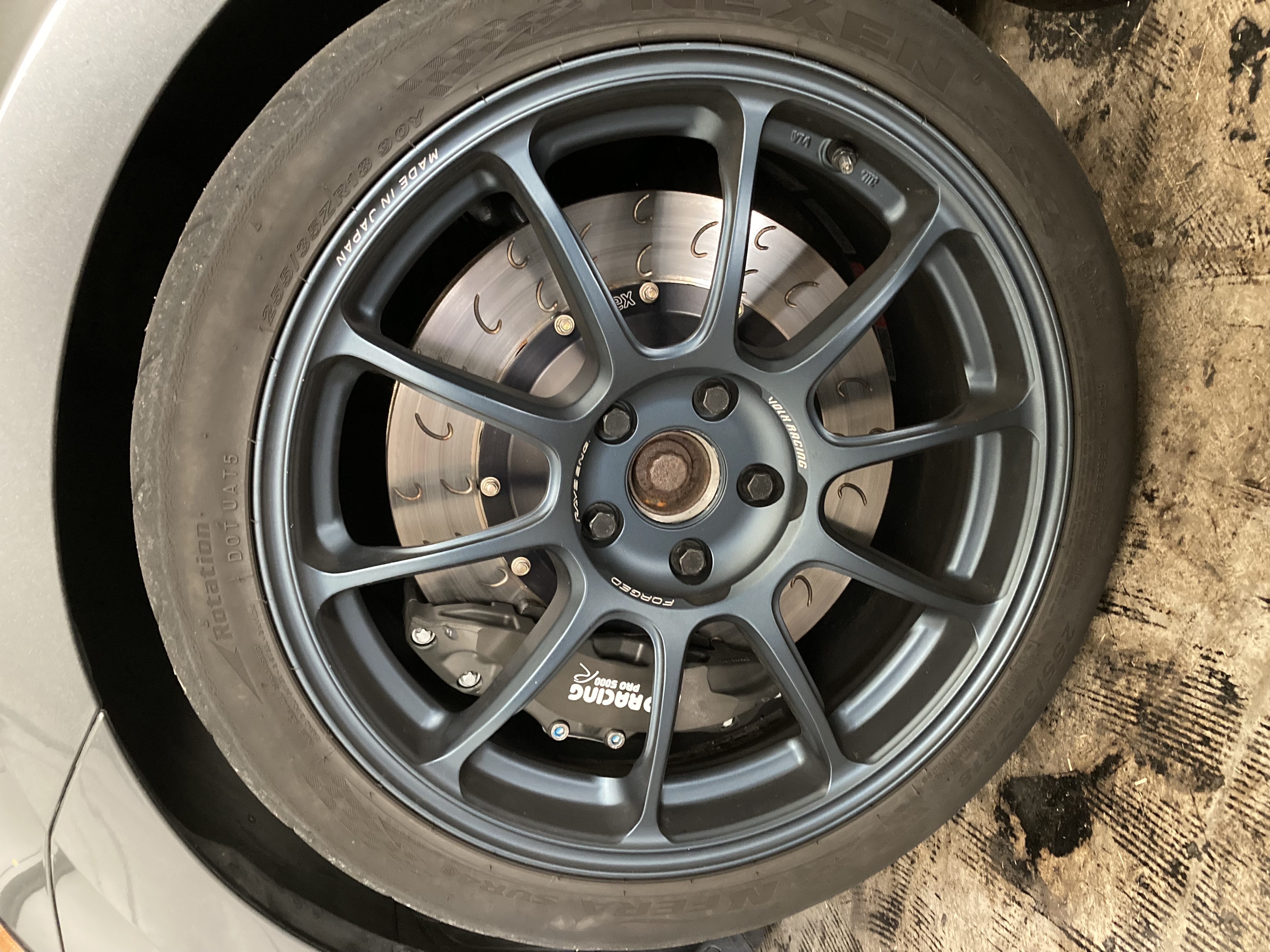 Wheels are matched front to rear. I have run: Titan-7 TS-5 18x8.5 +45, Volk Racing ZE40 18x8.5 +44, Volk Racing TE37 Saga 18x9 +45 (+50 offset with 5mm spacer, Face 2), Konig Rennform 18x9 +45. Ample clearance available on all wheels.