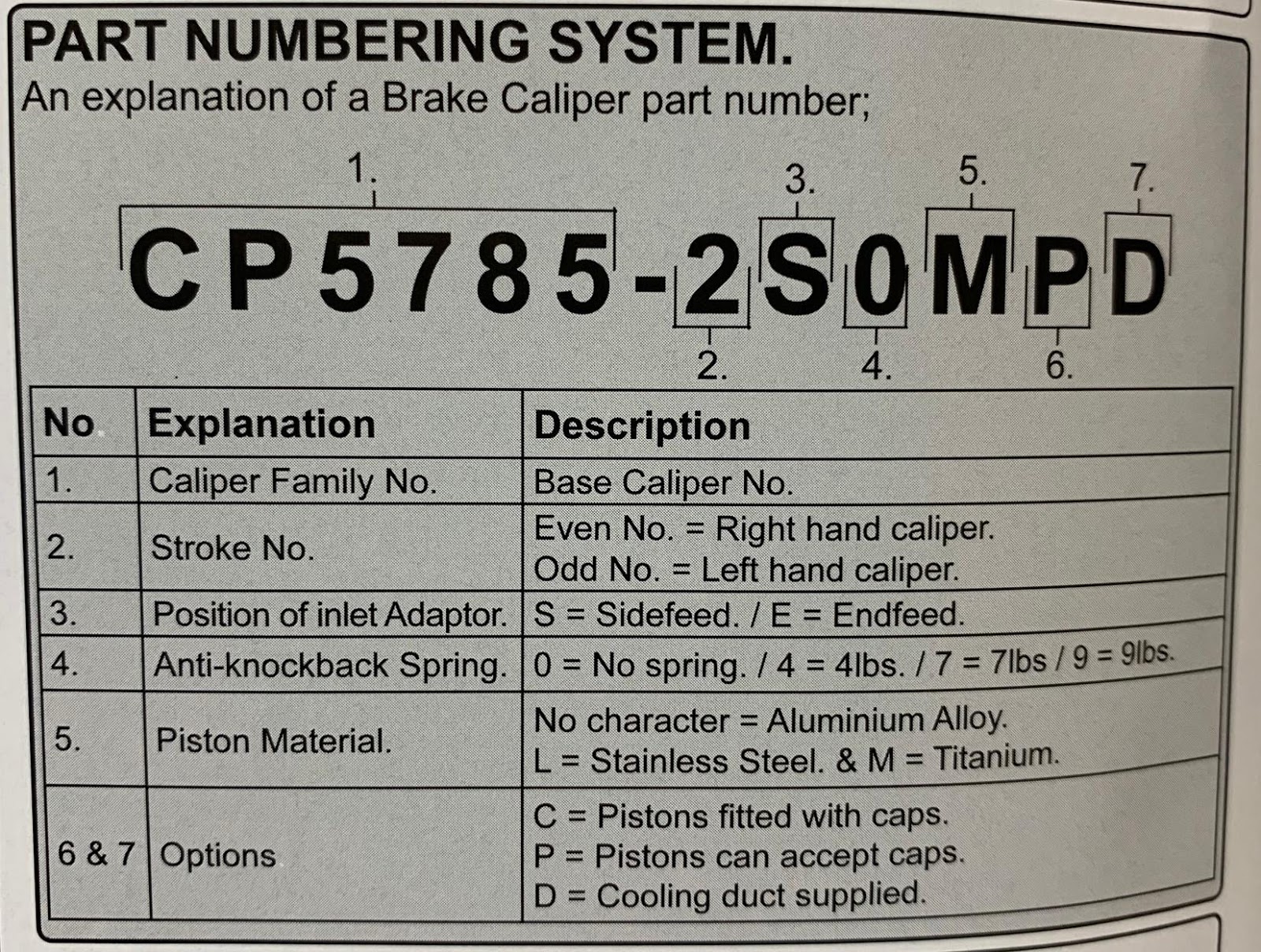 If you’re the particularly curious type, an explanation of the AP Racing caliper part number system can be found in the image below. Applying the numbering system to the Pro5000R caliper in the image above (CP9660-3S4L), we can decode the caliper as: