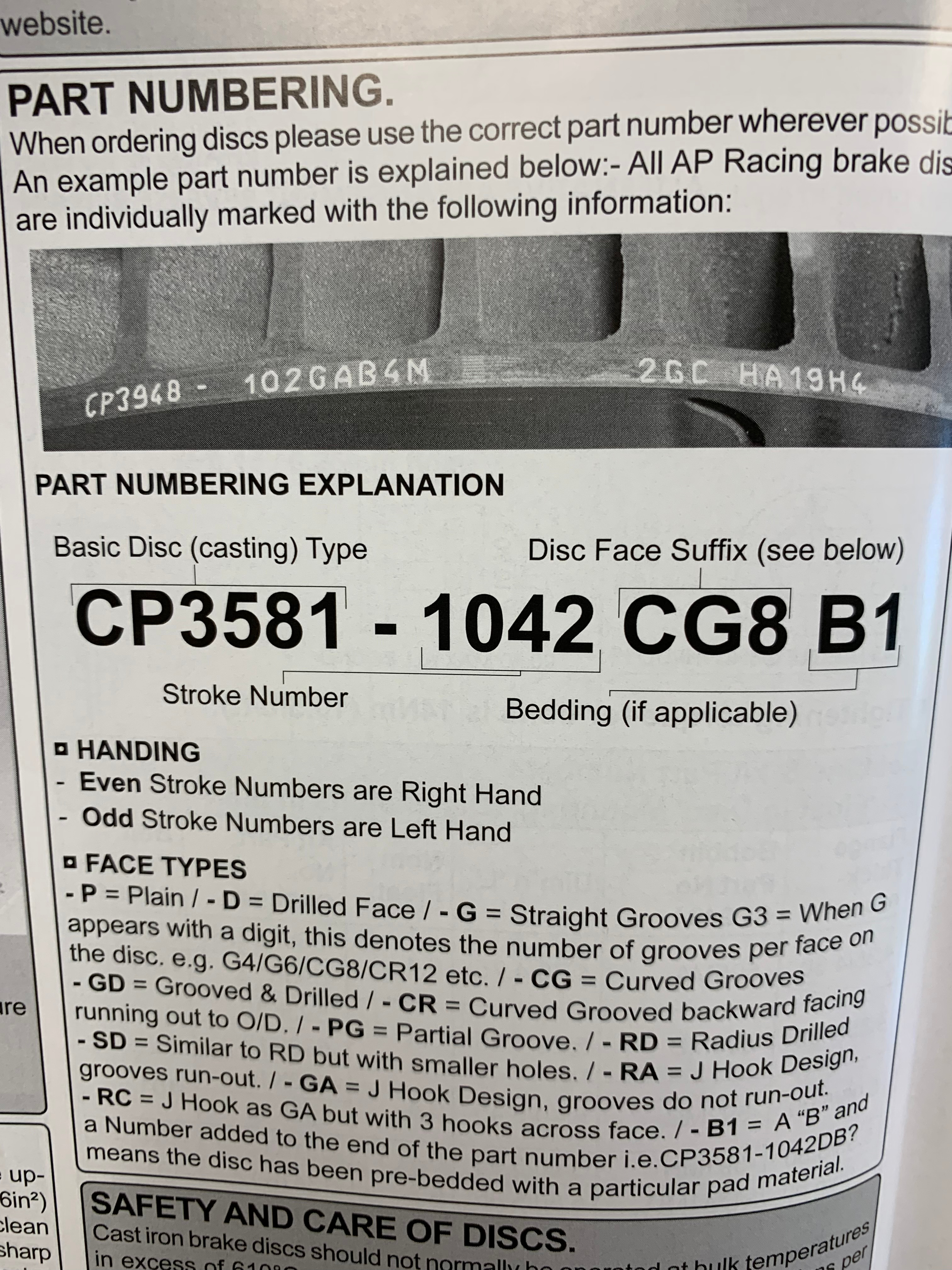 As with calipers, AP Racing has manufactured a tremendous array of brake discs over the years in varying sizes, shapes, slot patterns, etc. While some can be found in their current print catalog or on their website, many of the part numbers are no longer sold, and there are no longer references to them anywhere. To compound the problem, some companies have offered their own line of discs manufactured by someone other than AP Racing, but then applied AP's numbering convention to them! As a result, figuring out what exactly that hunk of iron in your hand actually is, may be more challenging than one would expect.
