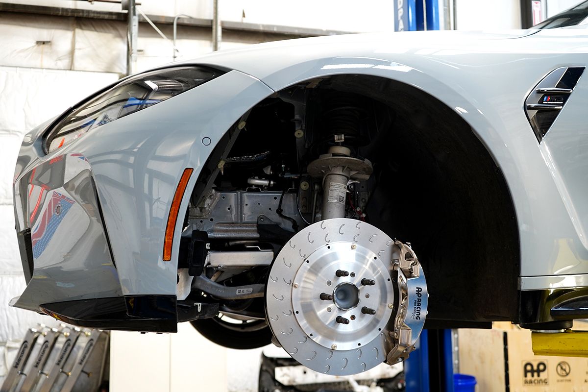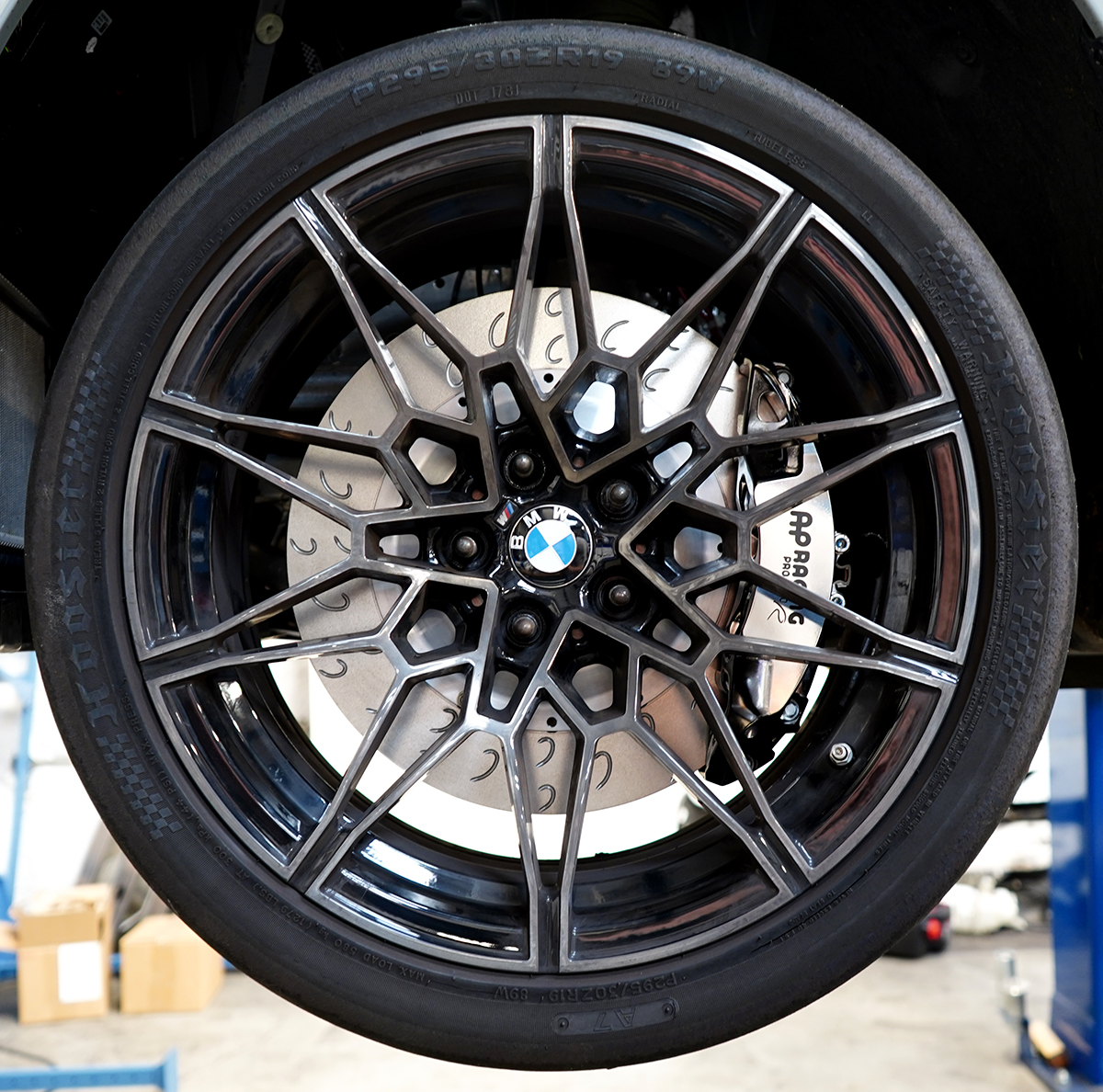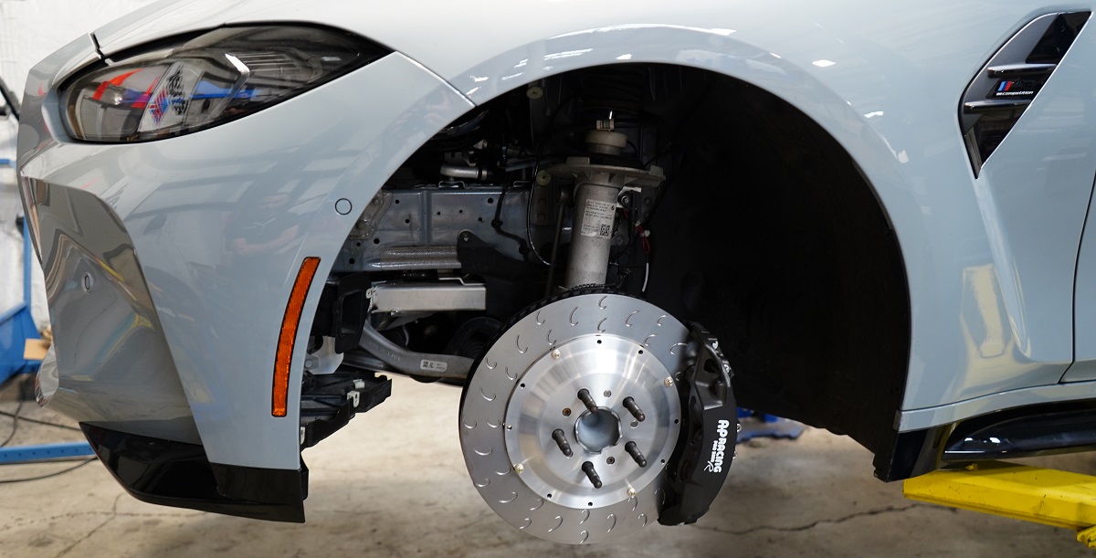 When it was first revealed, the polarizing look of BMW's G80 M3 (and G82 M4) seemed to dominate conversations surrounding the new platform. By any measure, however, the sheer performance on tap from its turbocharged S58 powertrain and excellent chassis is undeniably impressive, especially given that AWD Competition models tip the scales at close to 4000 lbs. To ensure these progressively longer, heavier, and more powerful M cars stop as well as they go, BMW has predictably resorted to giant brake discs and calipers on the front axle. This is most glaring with the Carbon Ceramic option, where overall disc diameter balloons to 400mm. While the standard M Compound iron brakes are slightly smaller at 380mm, you're still stuck with an abundance of excess unsprung weight. What's more, massive brake components dictate your choice in wheels and tires, and not necessarily in a good way. Road car manufacturers have been trending toward ever-larger wheel diameters for quite some time now. But for many of our clients who actually track their cars, shaving weight and saving money on tires (while also having more tire choices) is a higher priority.