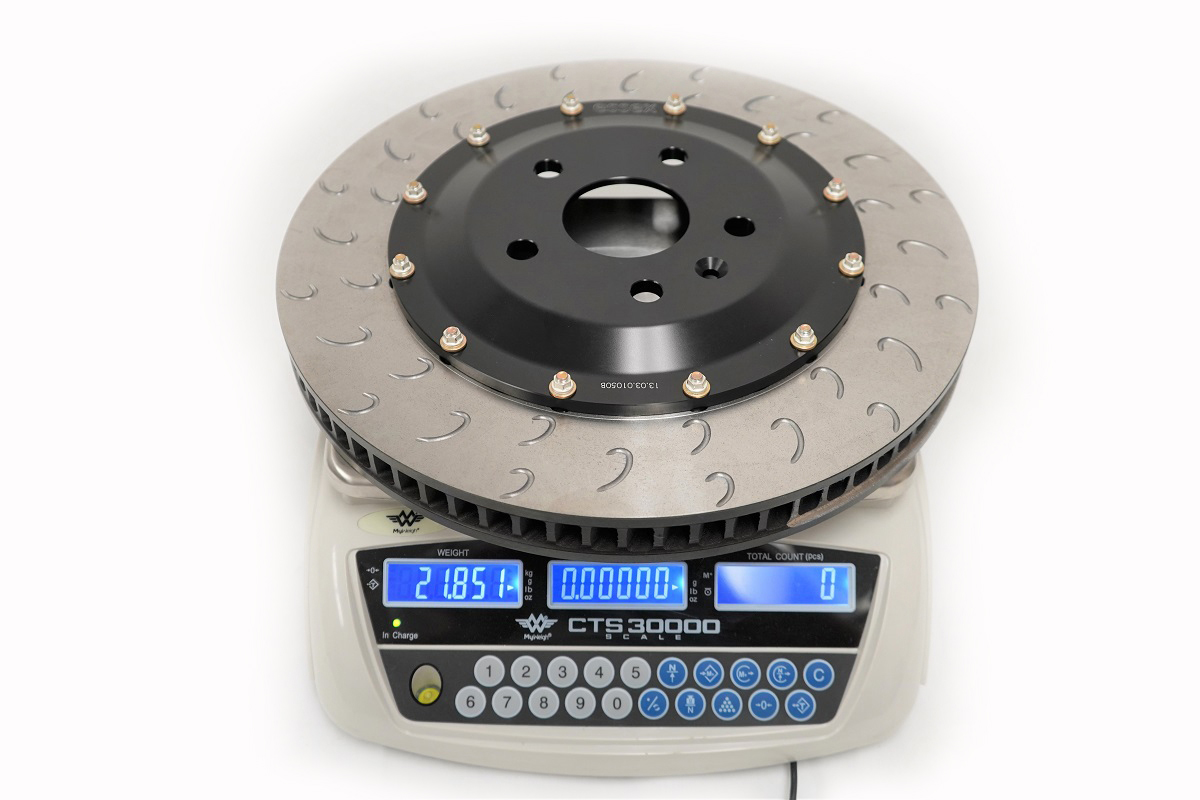 BMW's original equipment discs measure 380mm across with a a thickness of 36mm and 30 directional cooling vanes. This substantial piece tipped our scale at 27.9 lbs. with a significant amount of wear, meaning a new example would be at least 28 lbs. By contrast, a typical AP Racing by Essex 372x34mm disc comes in around 22 lbs., saving over 6 lbs. of unsprung weight per front rotor.