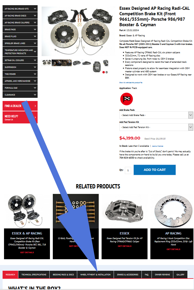 Please note however, that the general rule of thumb does not always hold true. For some applications, the wider CP9668 fits behind the OEM wheel without requiring a spacer or any other modification (C7 Z06 for example). Fortunately, we offer a downloadable wheel fitment template like the one shown below for every Essex Designed Competition Brake Kit that we manufacture. To check the fitment template for the kit you're considering, scroll down past the add to cart button and the related products section on the product detail page, and you'll see a series of tabs running horizontally across the screen. Click on the one that reads, "WHEEL FITMENT & INSTALLATION".
