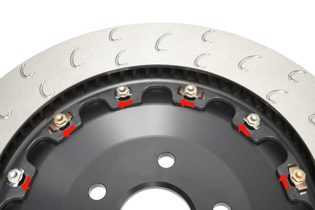 As discussed above with regards to the piston springs, knockback can be a serious issue when tracking a car. In order to help control the lateral motion of the disc, which pushes the pistons back into the caliper, we use an anti-knockback spring clip on every other disc attachment point (on a ten bolt disc there are five spring clips, while on a twelve bolt disc there are six). These spring clips help keep the disc hat and iron ring in alignment, while still allowing the disc to expand and float radially. As an added bonus, they prevent the hat and iron disc from rattling and making noise.