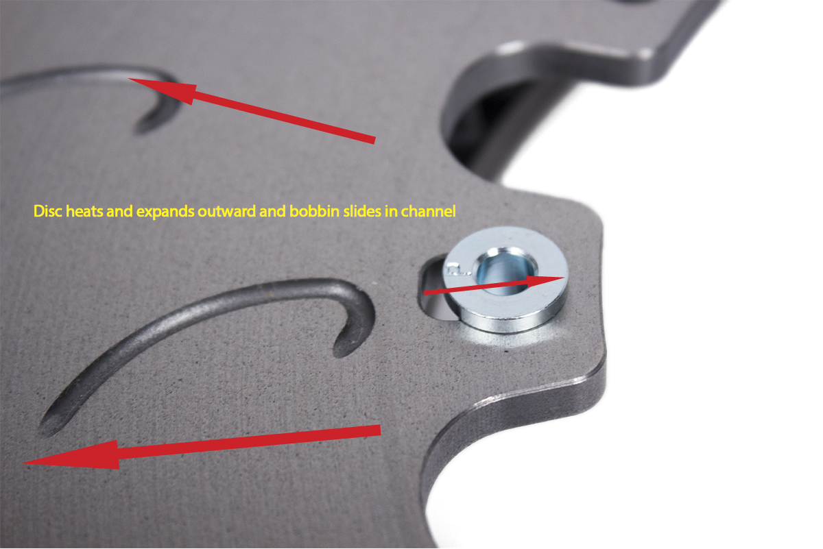 Our Spline Drive system eliminates the need for any type of bobbin, while also dispersing stresses across twice as many locations on the disc. The interlocking tabs not only provide the necessary room for radial float as the disc heats and expands, but also act as splines to directly transfer the torque under braking.
