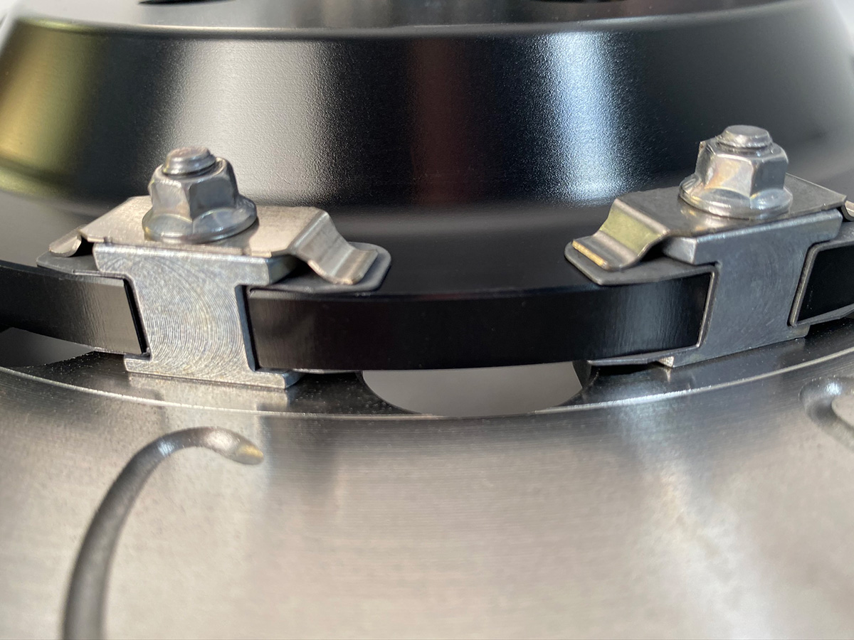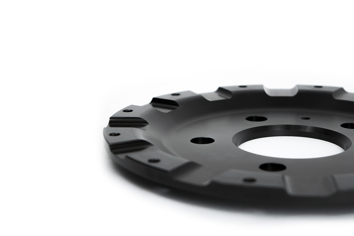 Floating two-piece discs also have the added benefit of reducing heat conduction to the hubs and bearings, decreasing wear and tear on these costly components. The disc hats themselves are manufactured from 6061 heat-treated billet aluminum, with a hard anodized coating. This material was specifically chosen for its strength at high temperatures, as it will be in direct contact with the searing hot iron discs. The hats feature scallops on the underside, to allow for heat evacuation along the outer disc face once installed.