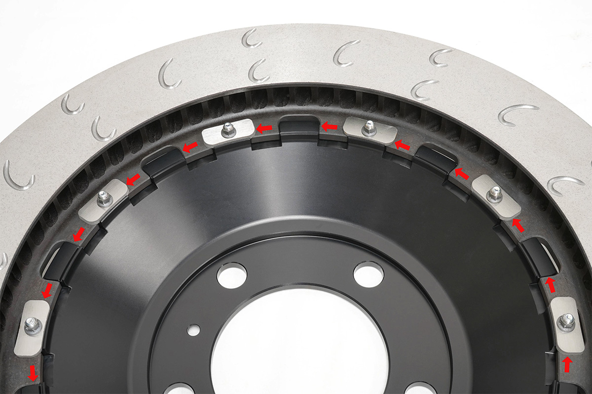Two-piece discs on the other hand, compensate for the expansion of the disc as it heats. This is accomplished by building ‘float’ into the 2-piece disc assembly, allowing the disc to run true inside the caliper and reducing distortion, stress cracks, and pad taper.