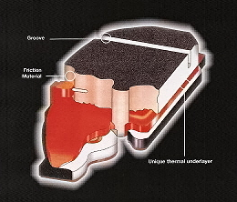 Racing brake pads frequently contain up to 35 ingredients, adhesives, fillers, friction modifiers, resins, and lubricants. In professional-grade racing pads, such as the Ferodo DS series of pads, the primary pad compound sometimes sits atop a thermal underlayer. The thermal underlayer is a thin mix of material pressed between the backing plate and the friction material. The underlayer helps ensure proper binding of the pad compound to the plate, but is specifically designed to prevent heat penetration through the backing plate and into the caliper pistons and brake fluid.