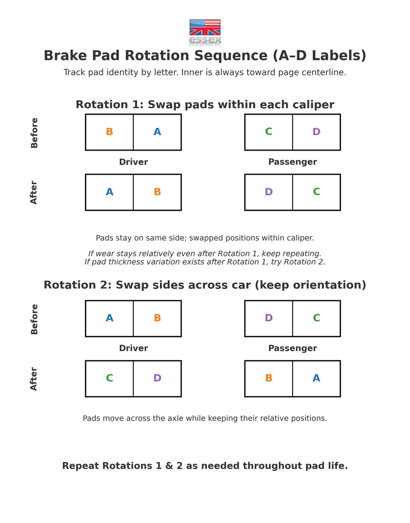 Below is a diagram showing how to rotate your pads to optimize wear. Rotation 1 is to swap pads from inner to outer, and outer to inner within the same caliper. You can repeat this rotation as long as your pads are wearing evenly. If after performing Rotation 1 you continue to see uneven wear, you can try Rotation 2. Rotation 2 moves the pads to the caliper on the opposite side of the car, while maintaining the same relative position. For example, if a pad was inside of the driver side caliper, you would move it to the inner position on the passenger side of the car. By doing so, you are making what was the leading edge of the pad the trailing edge, and vice versa (just like Rotation 1). However, by moving the pad to the opposite side of the car, you're also taking into account some of the forces that may be acting on the car due to weight transfer, track layout, etc.