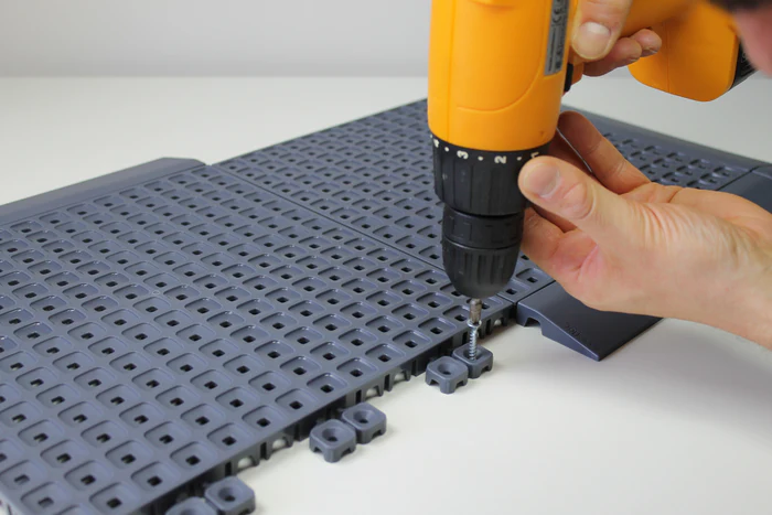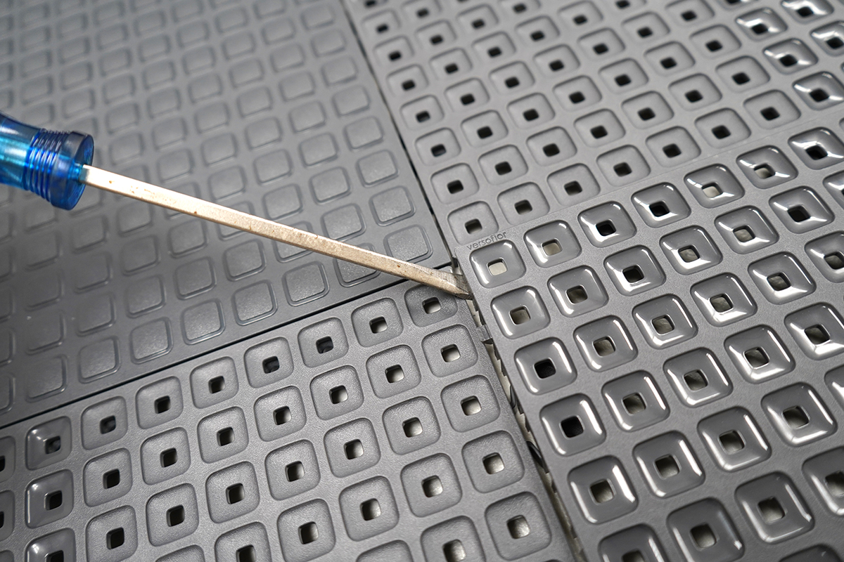 One of the problems we've found with other flooring products is that they can't be properly anchored to the ground. Not so with Versodeck. You can screw the connectors directly to the sub-floor, and then cover them over with an edge piece for a finished look. That means no more front edge lifting at the threshold of your garage, and it the tiles won't separate when you turn your car's wheels on them when entering the garage.