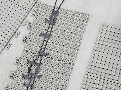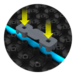 Here's where things get really unique with Versodeck. Upflor was designed from day one to help you incorporate underfloor RGB LED lighting into your designs. The holes in the top of the Upflor tiles are perfect for letting water drain through, but in a dry environment they’re also perfect for allowing light to shine upwards! Versodeck designed these tiles so you could simply clip an LED light strip into the channels under the tiles. You can also run any other type of wiring you need to run under the floor, up to 8mm in diameter. While you can use any LED light tape of your choice with these tiles, Versodeck developed a great one specifically as a companion to their tiles. The spacing on the Versodeck LEDS perfectly matches the spacing of the holes on the top of the tiles, so every bit of light shines through.