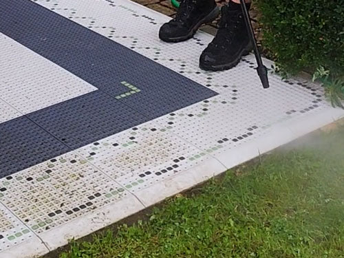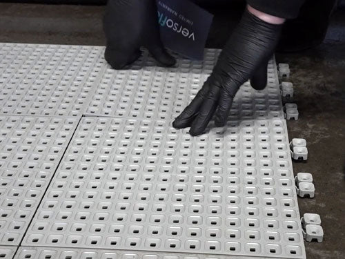 Versodeck is engineered to provide slip resistance, helping to prevent accidents and ensure firm footing in all climates. Taskflor, Upflor, and the small mosaics, all have a grabby texture on their surface, making them perfect for indoor our outdoor use. Upflor also allows liquids to drain through the small holes in the top, allowing the surface to dry quickly.